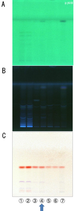 | Condition | (試料調製)各試料の粉末0.2 gにメタノール1.0 mLを加え、約5分間超音波処理を行った。遠心分離後、得られた上清を試料溶液とした。 (TLC条件)注入量:各10 μL、展開溶媒:酢酸エチル/メタノール/水(7:3:1)、検出:UV照射(254 nm、366 nm)、4-ジメチルアミノシンナムアルデヒド・塩酸試液噴霧後、加熱。 |