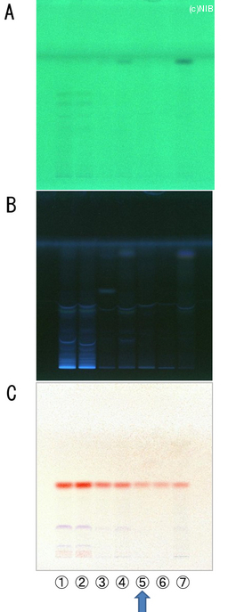 | Condition | (試料調製)各試料の粉末0.2 gにメタノール1.0 mLを加え、約5分間超音波処理を行った。遠心分離後、得られた上清を試料溶液とした。 (TLC条件)注入量:各10 μL、展開溶媒:酢酸エチル/メタノール/水(7:3:1)、検出:UV照射(254 nm、366 nm)、4-ジメチルアミノシンナムアルデヒド・塩酸試液噴霧後、加熱。 |