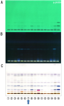 | Condition | (試料調製)各試料の粉末0.1 gにメタノール1.0 mLを加え、約5分間超音波処理を行った。遠心分離後、得られた上清を試料溶液とした。 (TLC条件)注入量:2または5 μL、展開溶媒:酢酸エチル/水/ギ酸(10:3:2)、n-ヘキサン/アセトン(7:3)、検出:UV照射(254 nm、366 nm)、バニリン・硫酸・エタノール試液噴霧後、加熱。 |