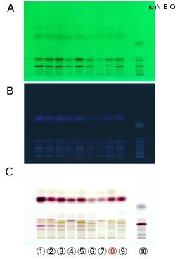 | Memo | A. 254nm B. 366nm C. 4-ジメチルアミノベンズアルデヒド試液(加熱) 4-dimethylamino-benzaldehyde test solution ①NIB-030 ②NIB-050 ③NIB-086 ④NIB-103 ⑤NIB-139 ⑥NIB-163 ⑦NIB-164 ⑧NIB-206 ⑨NIB-217 ⑩Atractylodis lanceae rhizoma |