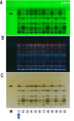 | Memo | A. 254nm B. 366nm C. 白色光 標:ルテオリン ①NIB-0803 ②NIB-0804 ③NIB-0805 ④NIB-0806 ⑤NIB-0807 ⑥NIB-0808 ⑦NIB-0809 ⑧NIB-0810 ⑨NIB-0811 ⑩NIB-0812 ⑪NIB-1120 ⑫NIB-1121 |