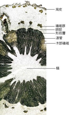 | コルク層、コルク細胞、皮層、柔組織、石細胞、師部繊維、道管、仮道管、木部繊維、放射組織、髄、でんぷん粒 |